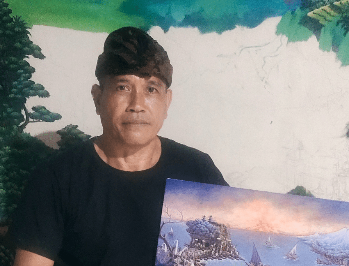 A 54-year-old painter from a village of artists. He learned to paint at 7 and pursued his passion while working at a nearby villa. Unlike his friends, Nyoman continued painting, inspired by his community’s artistic traditions. Joining Sanggar Seni Pelangi boosted his confidence. Instead of selling through distributors, Nyoman and his friends sold directly to their costumer, allowing them to use better materials and unleash their creativity. Nyoman’s unique paintings gained popularity, and he showcased them in exhibitions, finding joy in sharing his art. Painting isn’t just a hobby for Nyoman; it’s his way of life, and he hopes to preserve the tradition for future generations.