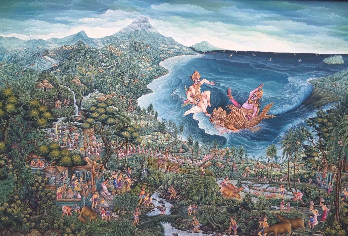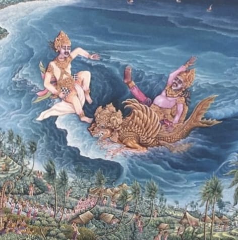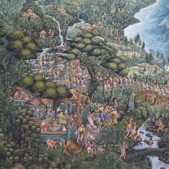 The painting uses a color palette of green, blue, and white to bring this legendary story to life, highlighting the rich cultural heritage of Bali and Nusa Penida.