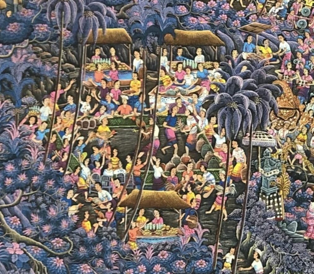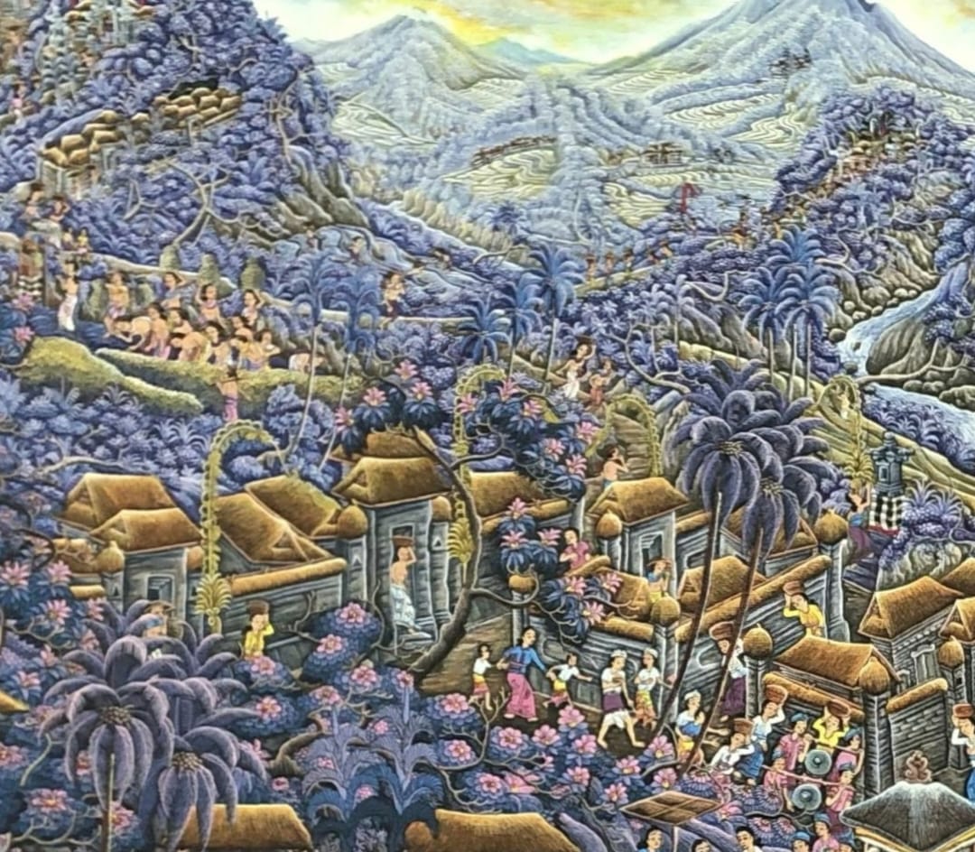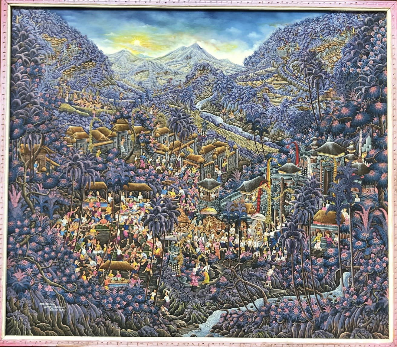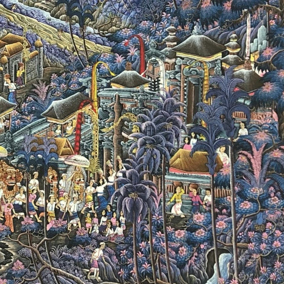 Nyoman Arep skillfully fuses the Young Artist painting style with traditional Balinese elements, creating a vibrant yet timeless piece. The serene palette of blue, brown, and white evokes a sense of tranquility and reverence, highlighting the spiritual connection between the Balinese people and their land.